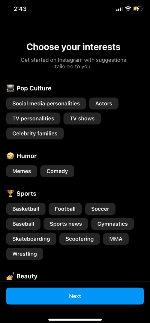 As this was a new feature being added to Instagram, it was important to maintain consistency by adhering to existing branding and design guidelines. The UI components and screens that I created were aimed to mimic closely to existing elements. I referenced existing screens that drove the UI design of my screens. For instance, I utilized the existing onboarding screens below for the onboarding screens for the dating feature.